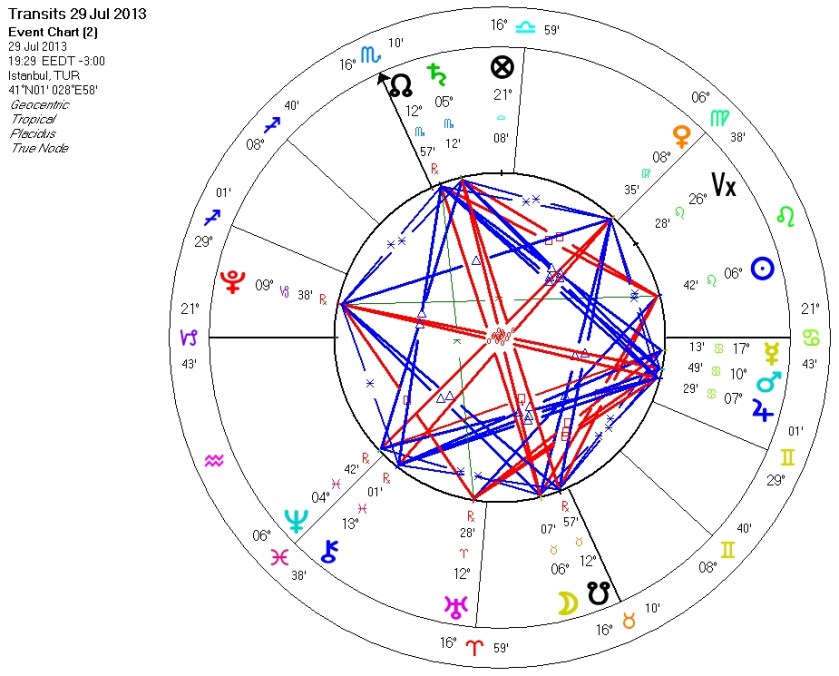 29 Temmuz 2013 günü Ay’ın Boğa’ya geçişiyle, gökyüzünde 6 köşeli Davudun Yıldızı (Büyük Sekstil) adını verdiğimiz nadiren oluşan kalıp Toprak- Su elementleri arasında oluşuyor.