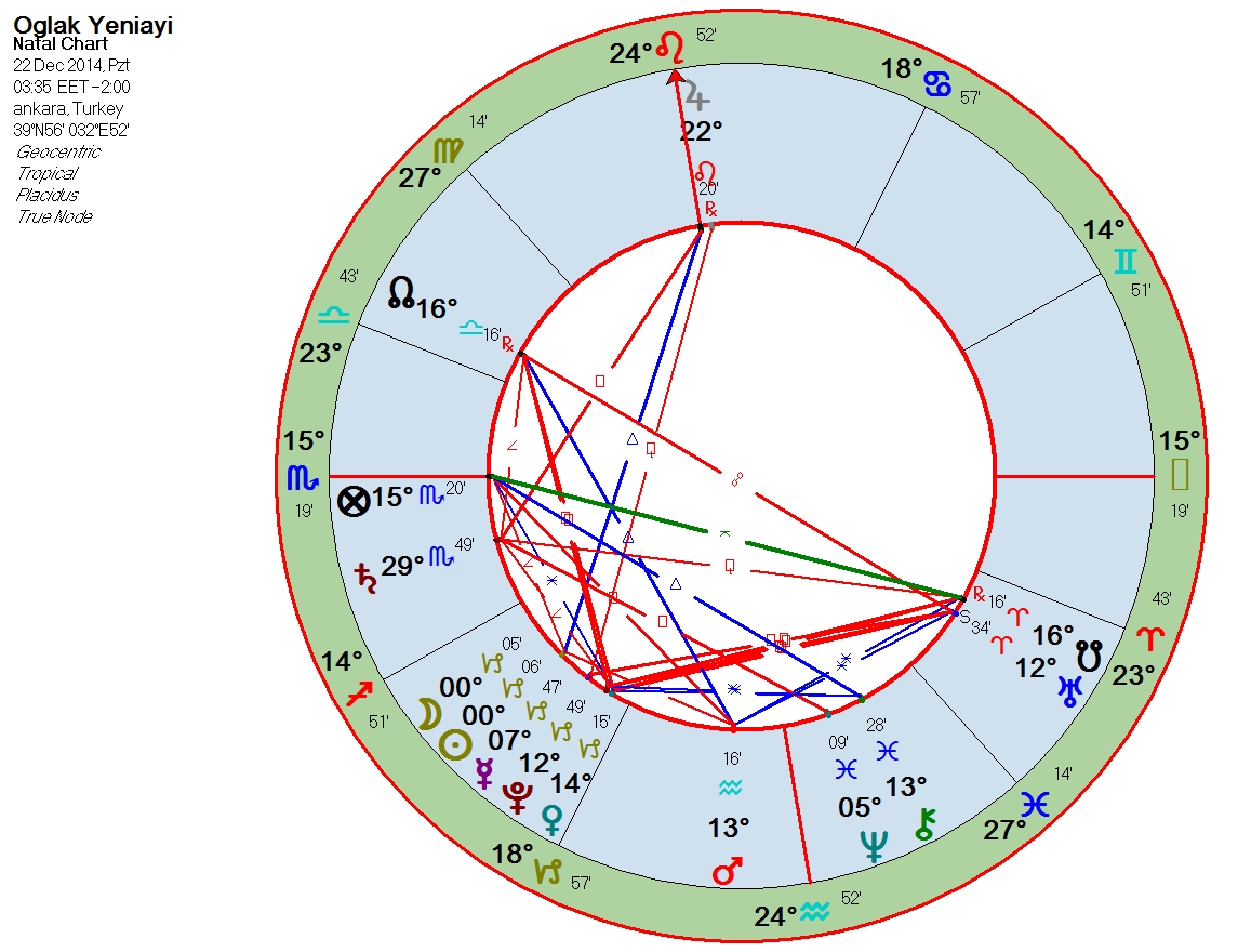 Güneş’in Oğlağa giriş anında Ankara’da ufukta Terazi yükseliyor olması eşitlik ve adalet temasına vurgu yapıyor. Uyum, denge ve ahenk önümüzdeki 3 aylık dönemin ana konusu olacak demektir. Politikanın, duygulardan ziyade mantıkla hareket etmenin önemi büyük olacaktır. Terazi’yi yöneten Venüs Oğlak’ta Plüton’la beraber hırs, tutku ve güç savaşları getirebilir.