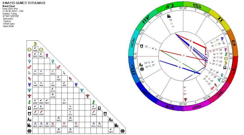 Hele 20-28 Mayıs arasında Mars tutulma derecesini (19º Koç) tetiklerken gücümüzü yeniden kullanabildiğimizi görebiliriz. Zaten 8 Mayıs’ta Boğa’da oluşacak yeni ay zamanı bir önceki Ay tutulması da(25 Mart’ta 5 derece Terazi’de Ay Tutulması) tetikleniyor. Mars 5 derece Koç’ta olacak.